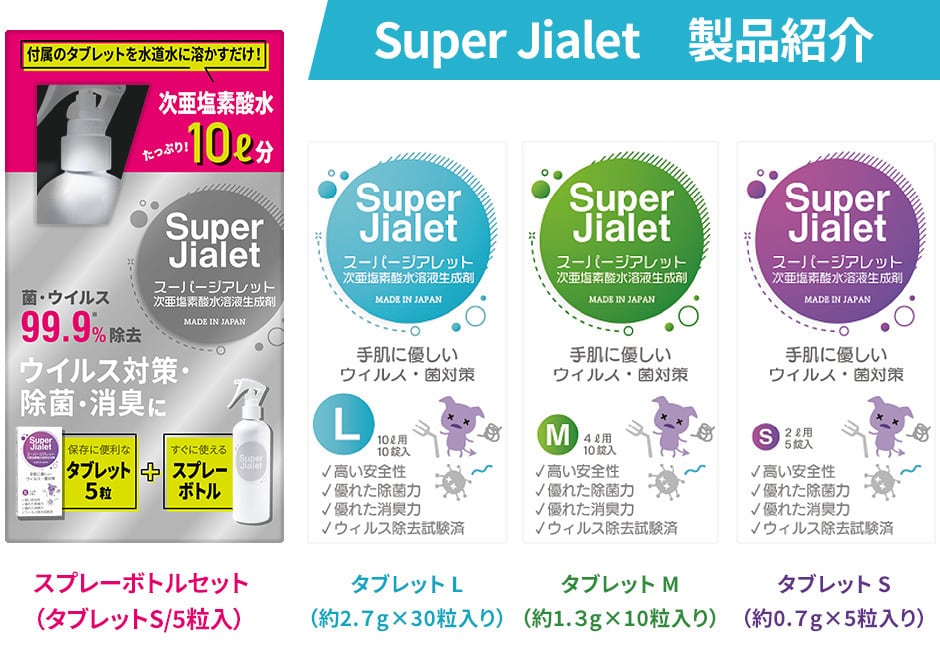 10リットルの水道水にスーパージアレットLを1粒溶解してください。 市販のスプレーボトルに入れ、除菌・消臭したいものに吹きかけ、きれいな布やペーパーなどで拭き取ってご使用ください。